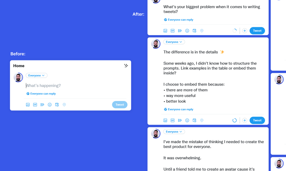 That's why I built a curated selection of prompts to help you write tweets in half the time. So you can focus on building the muscles.